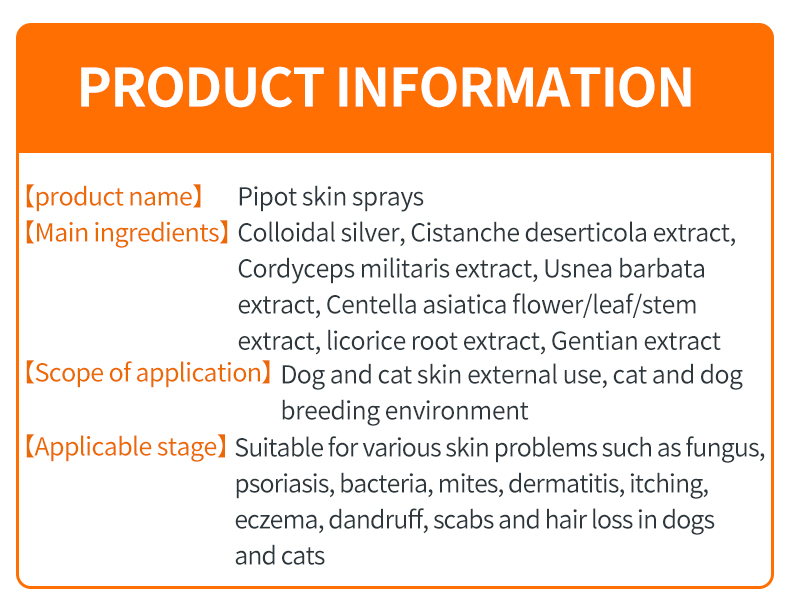 Shave your pet’s hair on the infected part, and spray it on the infected part directly till the skin is slightly wet, 3-5 times a day for 5-7 days. Keep the skin slightly wet if possible. In order to achieve the best therapeutic effect, you’re recommended to use the spray in conjunction with vitamins.