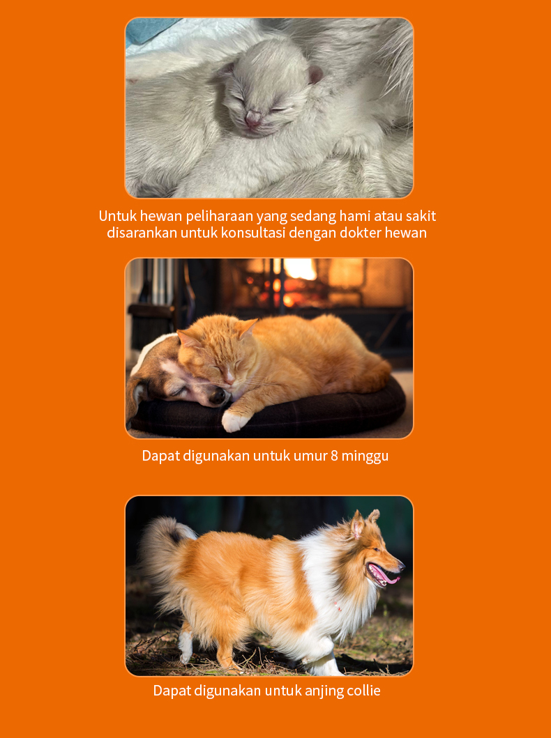 - Memberikan perlindungan anti kutu dan kutu loncat yang cepat dan tahan lama untuk hewan peliharaan usia 8 minggu ke atas