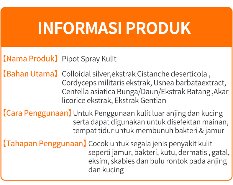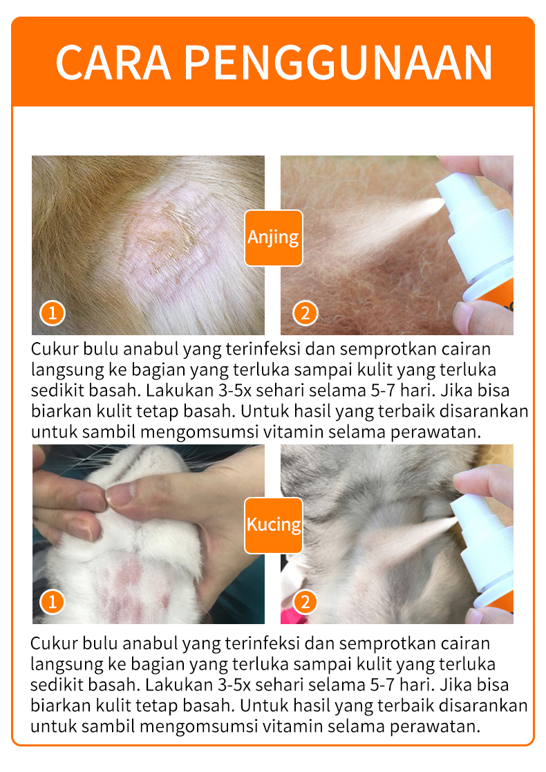 Cukur bulu hewan peliharaan pada bagian yang terinfeksi, lalu semprotkan langsung pada bagian yang terinfeksi hingga kulit agak basah, 3-5 kali sehari selama 5-7 hari. Jagalah kulit sedikit basah jika memungkinkan. Untuk mendapatkan efek terapeutik terbaik, Anda disarankan untuk menggunakan semprotan bersama dengan vitamin.